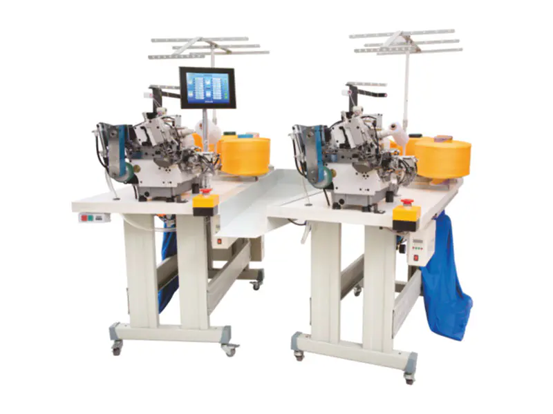 Автоматический оверлок для перчаток с функцией вшивания этикетки.